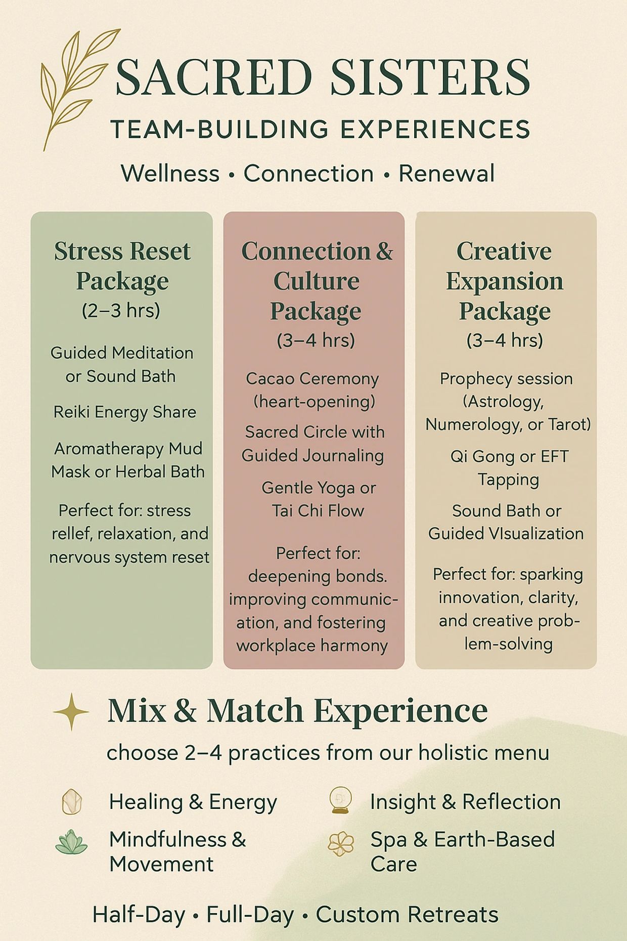 • Full-Day (5–6 hrs) → 3–4 Experiences + Optional catered wellness lunch